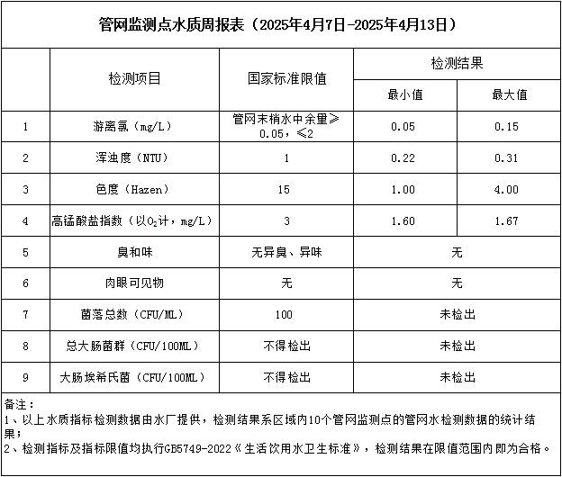 管网监测点水质周报表(2025年4月7日-2025年4月13日)