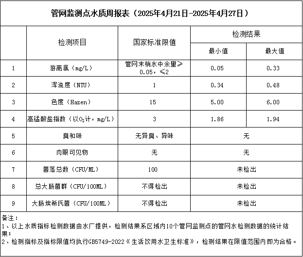管网监测点水质周报表(2025年4月21日-2025年4月27日)