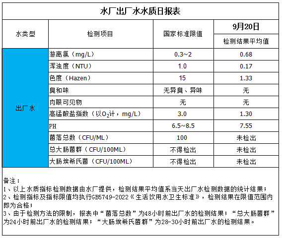 水厂出厂水水质日报表(2025-9-20)