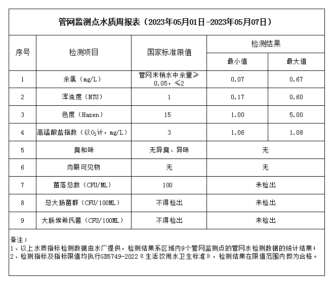 管网监测点水质周报表(2023年05月01日-2023年05月07日)
