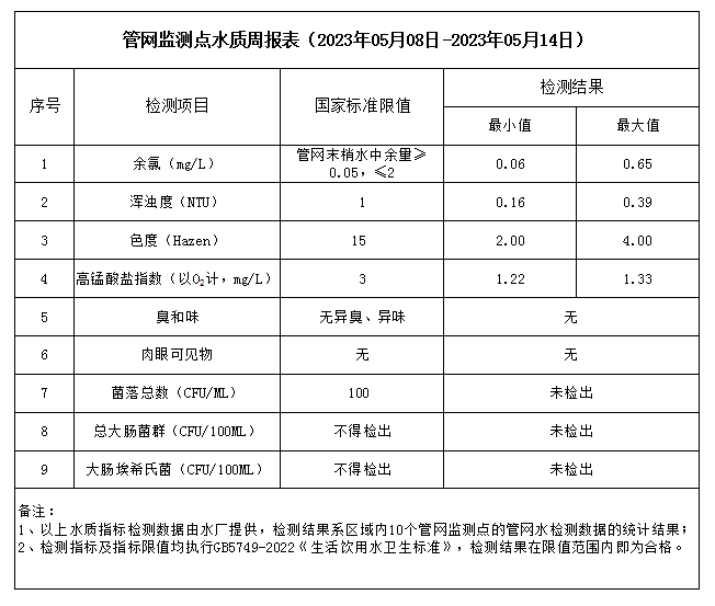 管网监测点水质周报表(2023年05月08日-2023年05月14日)