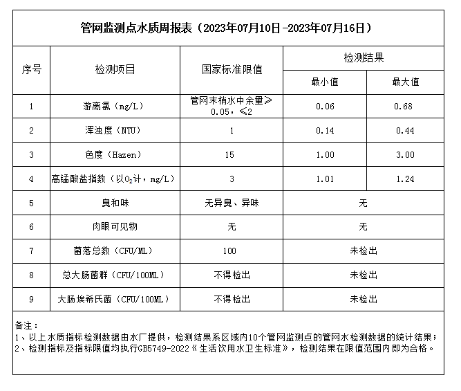 管网监测点水质周报表(2023年07月10日-2023年07月16日)