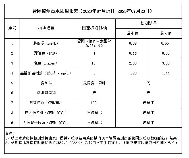 管网监测点水质周报表(2023年07月17日-2023年07月23日)