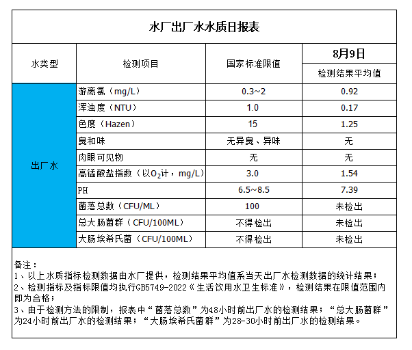 水厂出厂水水质日报表(2023-8-9)